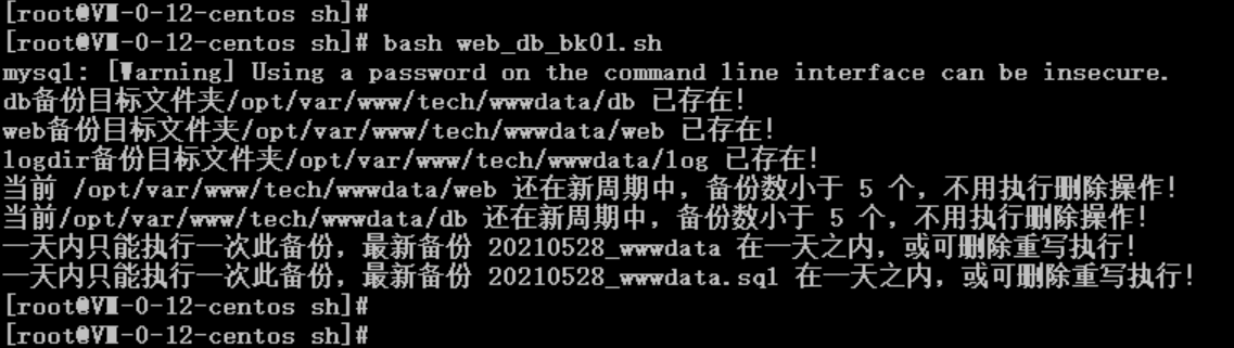 #by hewc#dbdir#是否首次执行_dbbkdir_number=`ls -ls $_dbbkdir | wc -l`if [ $_dbbkdir_number -le 1 ] ; then_bk_stet_time=`date +%F' '%T`echo -e "这是项目 $_dbbkdir 的首次备份执行!"echo -e "开始创建新的备份.....备份新文件名:$_bkprefix.sql ......开始时间为:$_bk_stet_time" >> $_logdir/$_logfilemt$_mysql_dpbin -h$_dbhost -P$_dbport -u$_dbuser -p$_dbpasswd $_dbname > $_dbbkdir/$_bkprefix.sqlif [ $? -eq 0 ] ; thensleep 1_bk_stet_time=`date +%F' '%T`echo -e "备份已完成.....完成时间为:$_bk_stet_time " >> $_logdir/$_logfilemtfielse#最新备份文件获取_latest_dbbk=`find $_dbbkdir -mindepth 1 -maxdepth 1 -type f -printf "%P " | sort -nr | head -1`#最新备份时间获取_latest_dbbk_crtime=`stat -c %Y $_dbbkdir/$_latest_dbbk`if [ `expr $_sttime - $_latest_dbbk_crtime` -ge $_bkinterval ] ; then_bk_stet_time=`date +%F' '%T`echo -e "开始创建新的备份.....备份新文件名:$_bkprefix.sql ......开始时间为:$_bk_stet_time" >> $_logdir/$_logfilemt$_mysql_dpbin -h$_dbhost -P$_dbport -u$_dbuser -p$_dbpasswd $_dbname > $_dbbkdir/$_bkprefix.sqlif [ $? -eq 0 ] ; thensleep 1_bk_stet_time=`date +%F' '%T`echo -e "备份已完成.....完成时间为:$_bk_stet_time" >> $_logdir/$_logfilemtfielseecho -e "一天内只能执行一次此备份,最新备份 $_latest_dbbk 在一天之内,或可删除重新执行!"fifififi